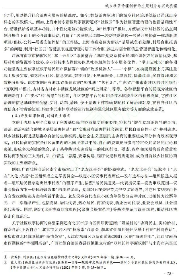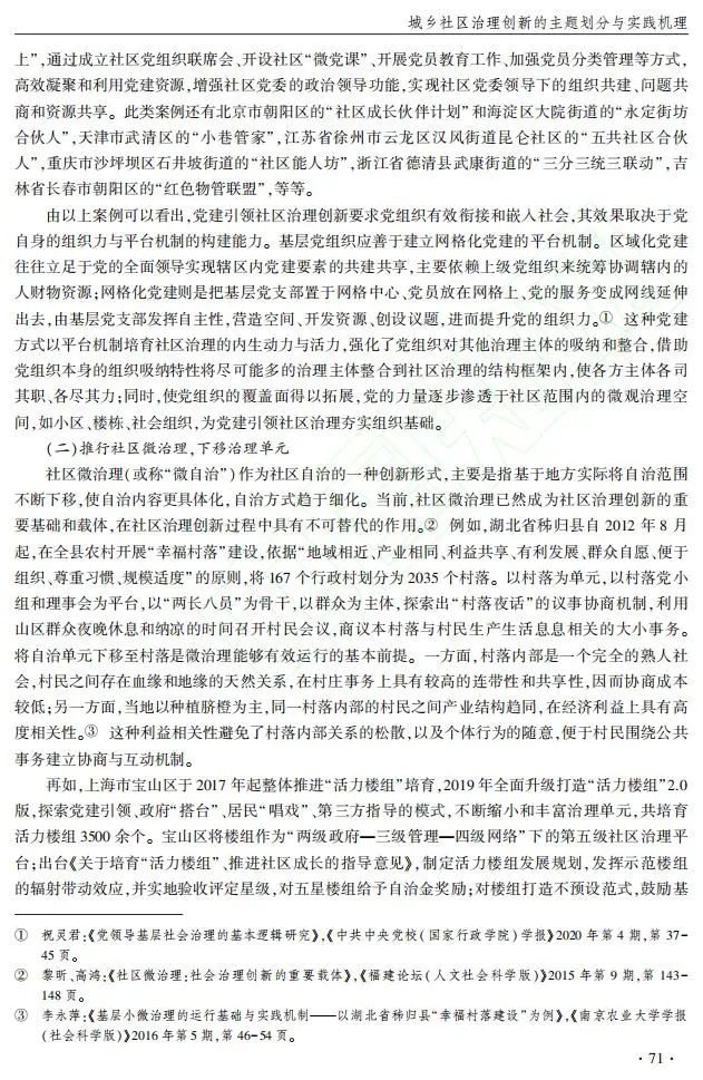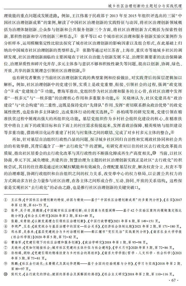 关于城乡社区治理创新,一些研究者基于实地调研和案例分析,描述出了社区治理创新实践形态,提炼出了影响城乡社区治理效能的重点问题或发展进路;也有一些研究者聚焦于当前社区治理创新实践典型案例和经验做法,对实践背后的深层逻辑加以解析。另外,也有学者进行了批判性研究,针对基层自治组织行政性凸显的问题,探寻城乡社区回归自治性和实现政社协同和社会共治的有效举措,有研究者对其背后暗含的一种去行政化的逻辑与改革提出了质疑与思考。在分析既有研究的基础上,全方位地归纳和解读城乡社区治理创新的实践主题具有十分必要的意义。