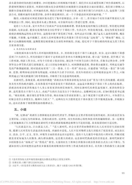作者发现,新时代国家对乡村的整合由“汲取式”向“供给式”转变,大量的民生工程和公共服务以政治任务的方式自上而下推行。当诸如农村人居环境整治等在乡镇基层政府眼里的日常性工作成为政治任务后,具体工作的落实就会被常规化执行,有时会出现选择性执行、替代执行等变通的策略行为,这使得国家的政策在落地时出现效能损耗,群众满意度不高。为了保证下乡资源的安全和有效性,国家将各种规范、标准、监督、检查也下沉至乡村,同时,借助新技术,群众可以越过基层政府向更高级别的政府投诉,国家和社会对乡镇基层政府实现了全方位的监督。当基层政府在执行政策过程中的偏差被发现时,上级政府就会以党纪进行处理、纠偏,以保证政治任务的顺利推进。在讲政治的要求转化为内在主动时,在全面的监督下,党员干部面对跨层级的“陌生人”督查、个人被追责及压力源的多元化下,从内心上产生了巨大的压力,这也是所有基层干部积极主动地干事创新的主要动力。