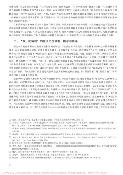 作者从新时代背景下“压力型体制”理论的变化入手,厘清“压力型体制”的发展脉络,梳理理论的发展历史,结合时代特征创造性提出了“政、纪驱动”的新压力型体制的概念,并就其概念内涵、生成机理和运作逻辑的层面基于“案例—归纳—演绎”的分析框架,高屋建瓴地做了结构性论述,并指出了在当前社会主要矛盾发生变化的时代背景下,新压力型体制面对的老问题和新挑战。本文为基层治理的体制性改革与打破乡村治理的制度性困境、实现乡村治理现代化作出巨大贡献。
