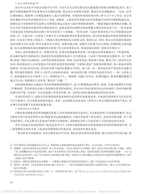 调查研究是谋事之基、成事之道,没有调查,就没有发言权。唐鸣老师的文章基于对J省S市F县G镇“农村人居环境检查督导”案例的观察与分析,采用“解剖麻雀”的研究方法,结合新时代新的时空背景,提出“政、纪驱动”的新压力型体制。文章通过阐释“政、纪驱动型”压力型体制的概念内涵,分析其运行方式与原因,总结其运行逻辑以破除旧压力型体制研究存在的解释力局限。其中,文章第四部分在解释新压力型体制的运作逻辑时,我明显认识到作者对于G镇有较为深入的了解,其多样化调研手段、精细化研究分析、逻辑化文本阐述值得我们学习。