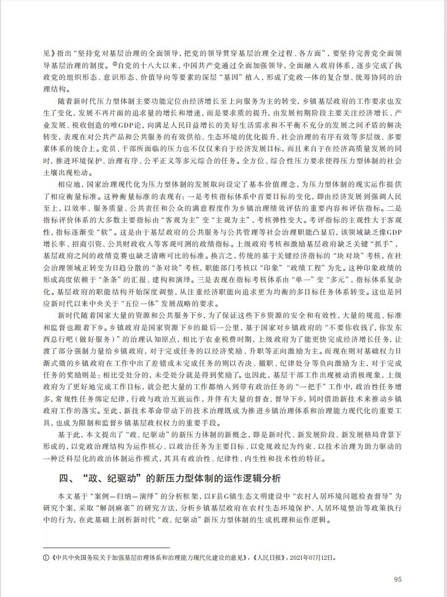在社会主要矛盾和社会治理目标转变的新时代背景下,压力型体制分析概念在乡镇治理场域的解释力暴露不足。作者以G镇“农村人居环境问题检查督导”事件为分析案例,对县乡政治生态进行细致剖析,提出“‘政、纪驱动’的新压力型体制”这一泛科层化的政治体制运作新模式。工作任务的政治化、党规政纪的约束化、督查督办的技术化以及外部压力的内生化,使新压力型体制呈现政治性、纪律性、技术性和内生性的新特征。本文对新时代乡镇治理场域新变化进行了高度理论提炼,弥补了既有理论的不足,具有较高的时代性、前沿性与创新性。