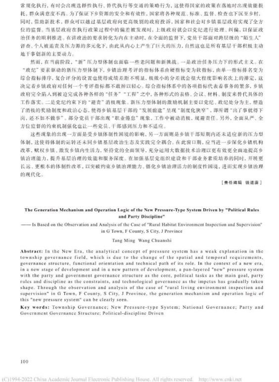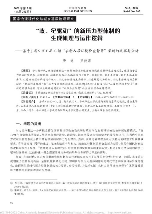 作者针对这一问题,首先梳理压力型体制的内涵、运作机理和异化反应,辨明新时代压力型体制作用的时代背景和发展目标出现的变化,继而阐明新时代压力型体制新的核心要素、时代特征,并结合G镇“农村人居环境检查督导”案例分析新压力体制的生成机理和运行逻辑。