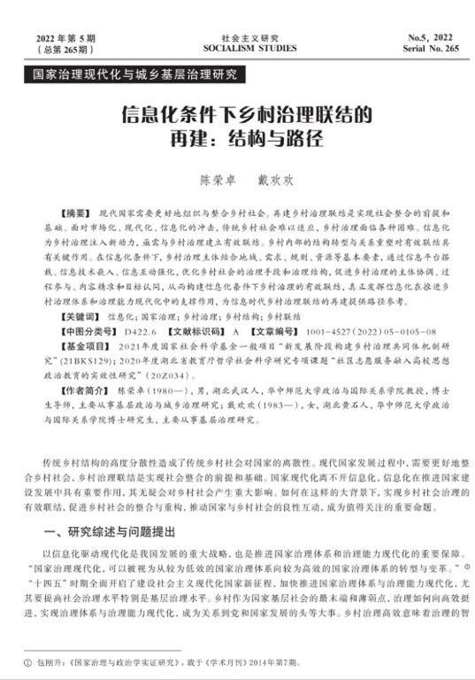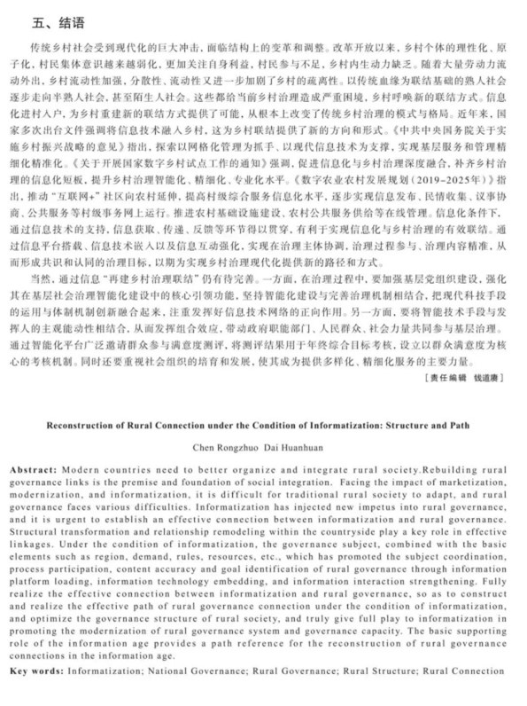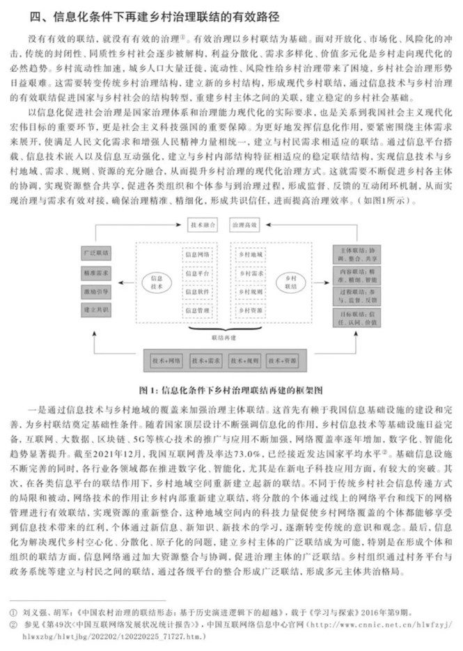 乡村治理作为中国基层社会治理重要组成部分,其发展关系着国家治理体系和治理能力现代化的有效推进。在全球信息化发展的时代,作者基于信息化驱动现代化,以及改革开放以来传统乡村社会分散的现状,提出信息化条件下的乡村治理应充分利用信息技术,再建乡村治理联结,逐步实现乡村社会的组织与整合。在此条件下,信息化能充分为乡村社会注入活力,激发乡村社会内生动力。作者也提到,“没有有效的联结,就没有有效的治理”。文章提出再建乡村治理联结的有效路径,结合乡村各方资源,强调加强治理主体、内容、过程以及目标的联结,使信息化充分嵌入乡村社会。