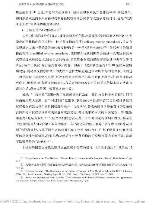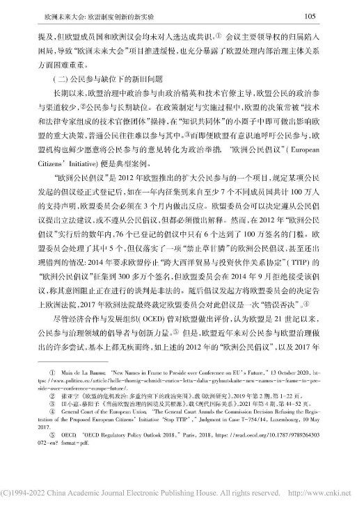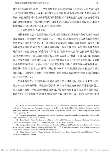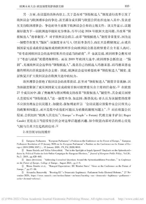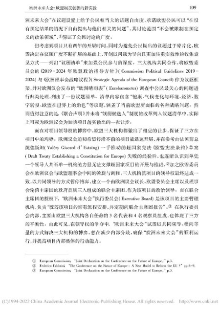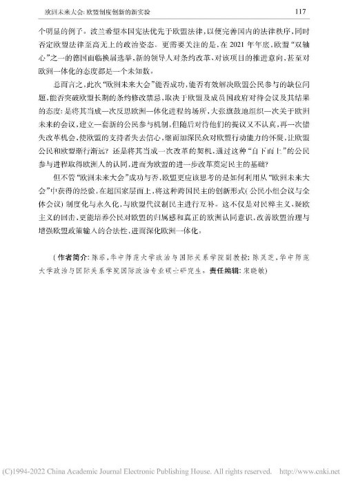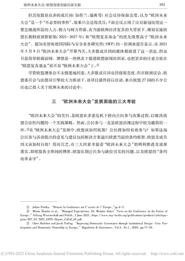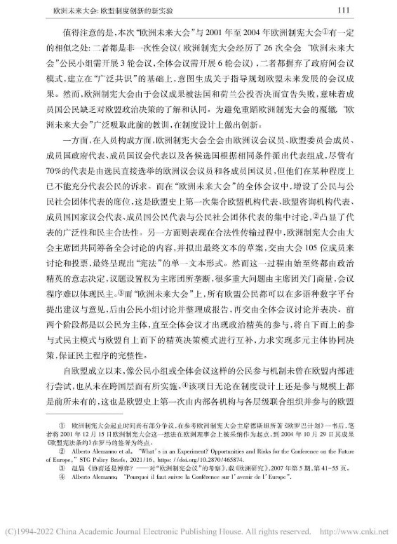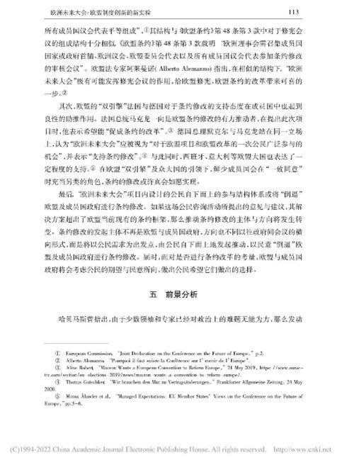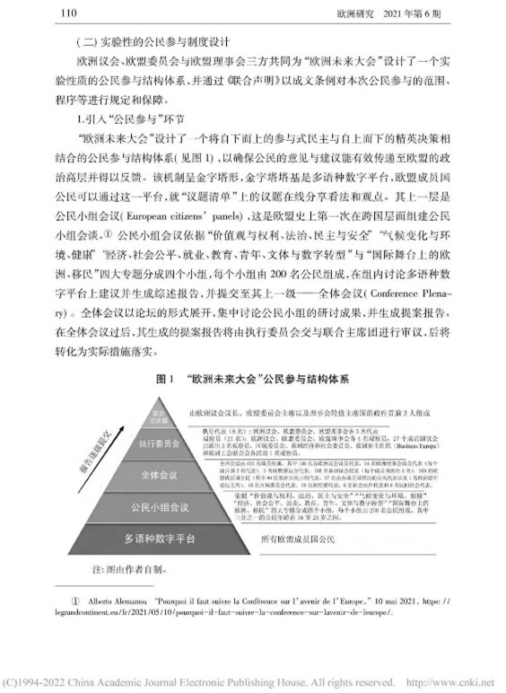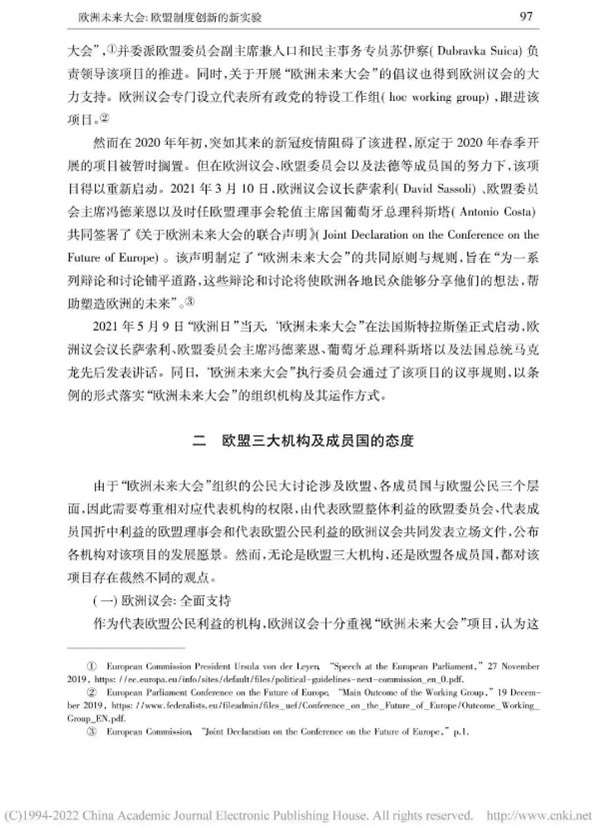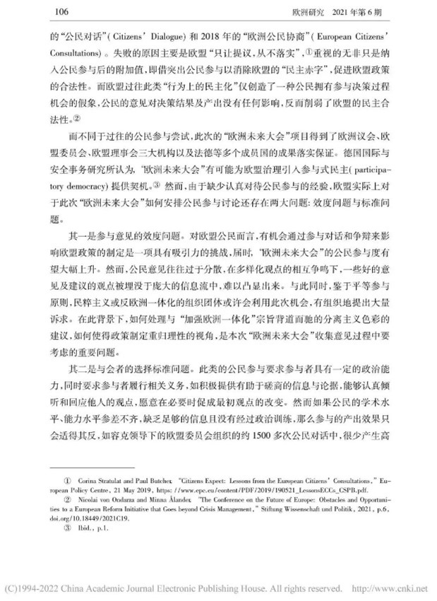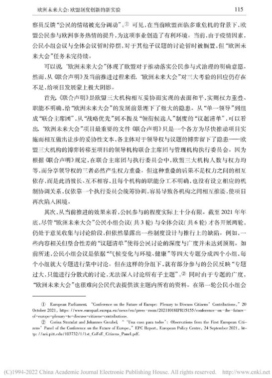 本文从多角度对“欧洲未来大会”展开辩证分析,内容丰富,层次清晰。欧洲未来大会通过搭建自下而上的参与式民主与自上而下的精英决策相结合的公民参与体系,推动公民科学、高效参与政治生活,促进欧盟条约改革。同时,我也了解到会议所面临的困难,例如时间紧迫、议题复杂、欧盟公民参与缺位、欧盟长期存在的条约修改禁忌等问题。此次实验性尝试潜力与隐患并存,因此,“欧洲未来大会”的发展走向将更加依赖于欧盟及各成员国的诚意和政治智慧。