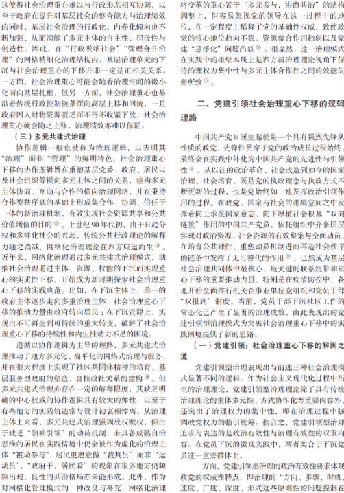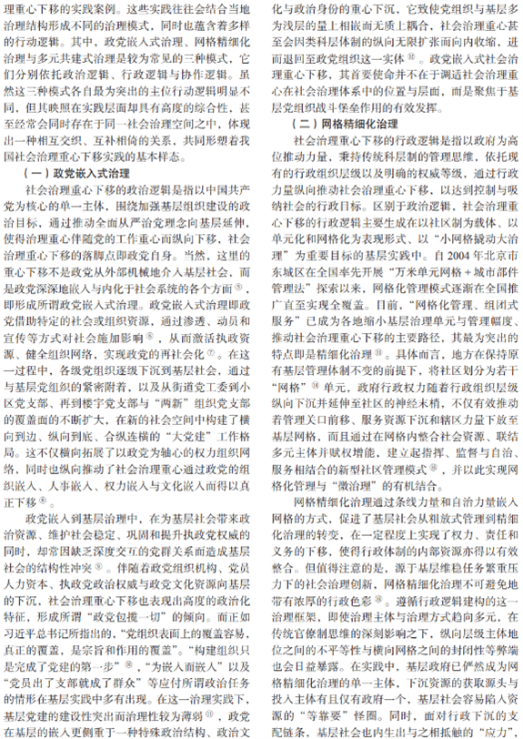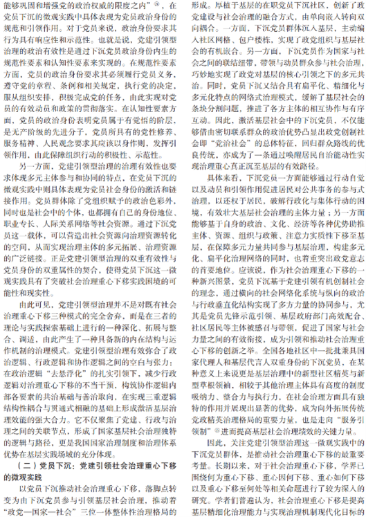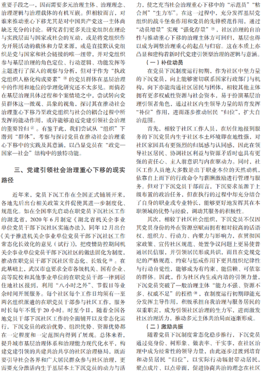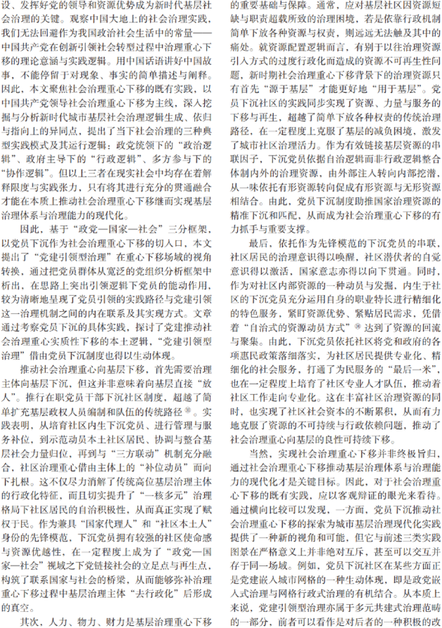 文章聚焦于社会治理重心下移的主题,从下沉党员的微观视角,深入探究社会治理重心下移实践过程中的主体及其功能,呈现出党员引领的实践路径与党建引领这一治理机制之间的内在联系及其实现方式。作者首先从政治逻辑、行政逻辑和协作逻辑三条行动逻辑,对当下社会治理实践中政党嵌入式治理、网格精细化治理和多元共建式治理三种主要模式的运作逻辑进行分析,指出了三种治理方式的治理困境与解决措施,即无法单独运行,而需要贯通融合以提高基层社会治理效能。由此,作者提出党员下沉引领社会治理重心下移的有效性,党的权威性不仅能够引领多元治理主体进行共治,而且可以在群众当中发挥先锋模范作用,实现三种典型治理模式的融合发展,表现在补位动员、激励共振和资源链接三种实现路径。