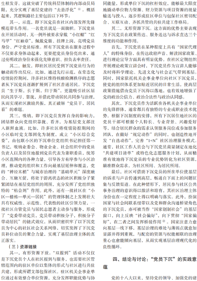 习近平总书记强调,要把加强基层党的建设、巩固党的执政基础作为贯穿社会治理和基层建设的一条红线。学者们普遍认为社会治理重心下移是提高基层精细化治理能力与实现治理机制现代化目标的重要手段之一。作者以新的视角为切入点,尝试从“组织”下潜到“群体”,考察与探讨党员在推动社会治理重心下移中的实践及其意涵,以凸显党员在“政党—国家—社会”结构中的独特功能。作者提出党员下沉制度通过补位动员、激励共振和资源链接的途径发挥其政治优势、组织优势和资源优势,进一步夯实了城市社区善治的微观基础,极大地丰富了社会治理中心下移的实践经验和学理要义。