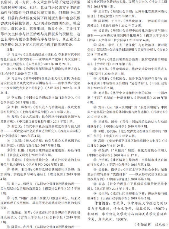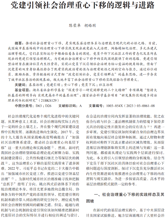 重心下移是党坚持全心全意为人民服务宗旨的一次治理实践探索,对实现基层治理体系与治理能力现代化有重要作用。作者对比研究政党嵌入式治理、网格精细化治理和多元共建式治理的实践样态,认为破除社会治理重心下移困境需要转换视角,把党员群体从党组织分析框架中析出,突出引领逻辑下党员的能动作用,推行“党建引领型治理”。另外,作者还提出推行党建引领社会治理重心下移应该注重补位动员、激励共振、资源链接。本文清晰地论述了党员引领与党建引领之间的内在联系、实现方式,这丰富了社会治理重心下移的实践经验与学理要义,夯实了社区善治的微观基础。