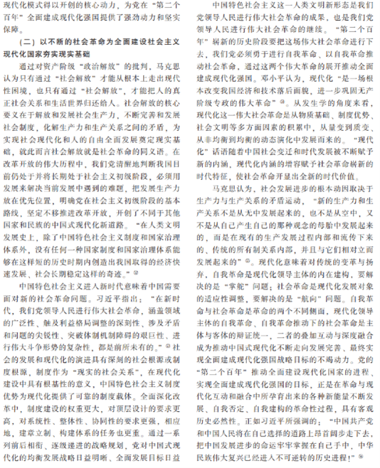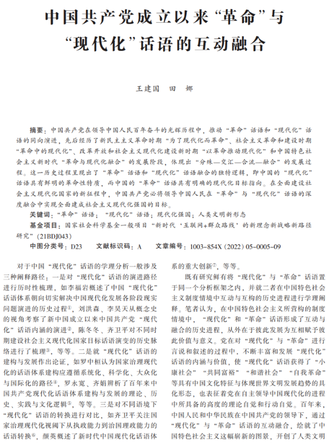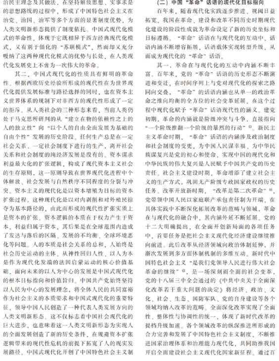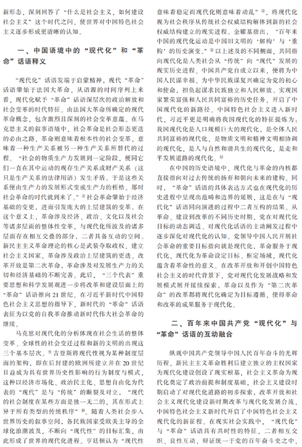 百年征程中,中国共产党领导中国人民和中华民族,融合了“现代化”与“革命”话语,不断丰富发展“现代化”的内涵与价值。文中以历时性的视野,分析出“现代化”与“革命”话语历经了“分殊——交汇——合流——融合”的发展过程,这也恰好反映了中国共产党作为中国现代化的领导主体,始终坚持自我革新,不断开拓中国式现代化发展的新境界。“革命”与“现代化”的内涵与价值在互动中得以丰富、拓展,有利于更好地构建起中国式现代化的话语体系,为全面建设社会主义现代化国家添薪助力。