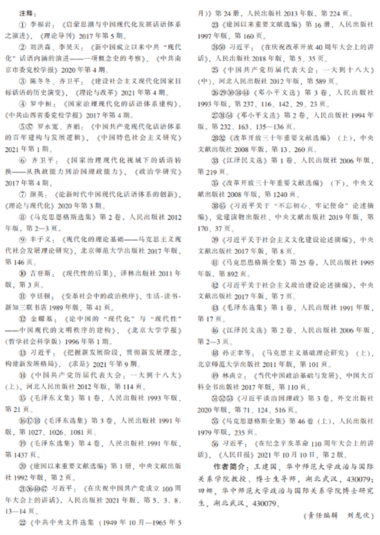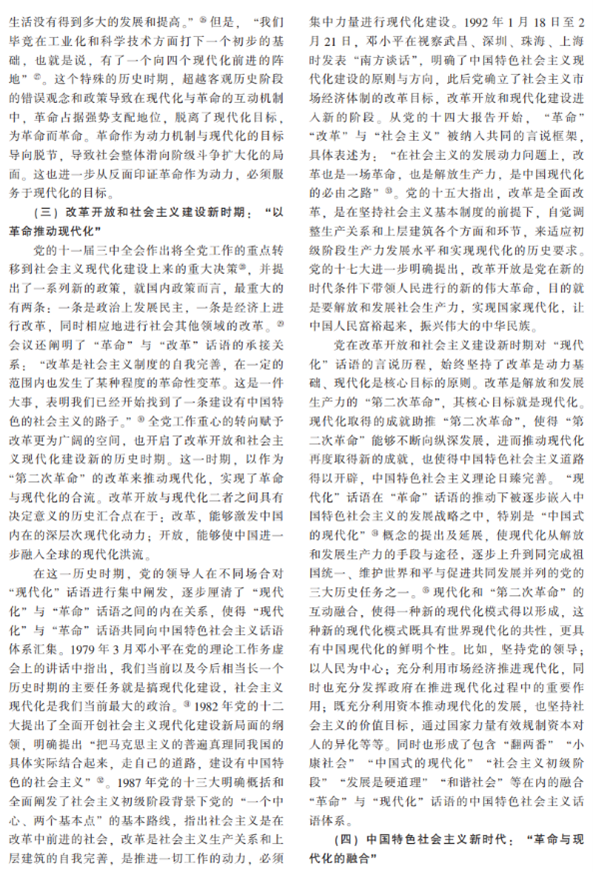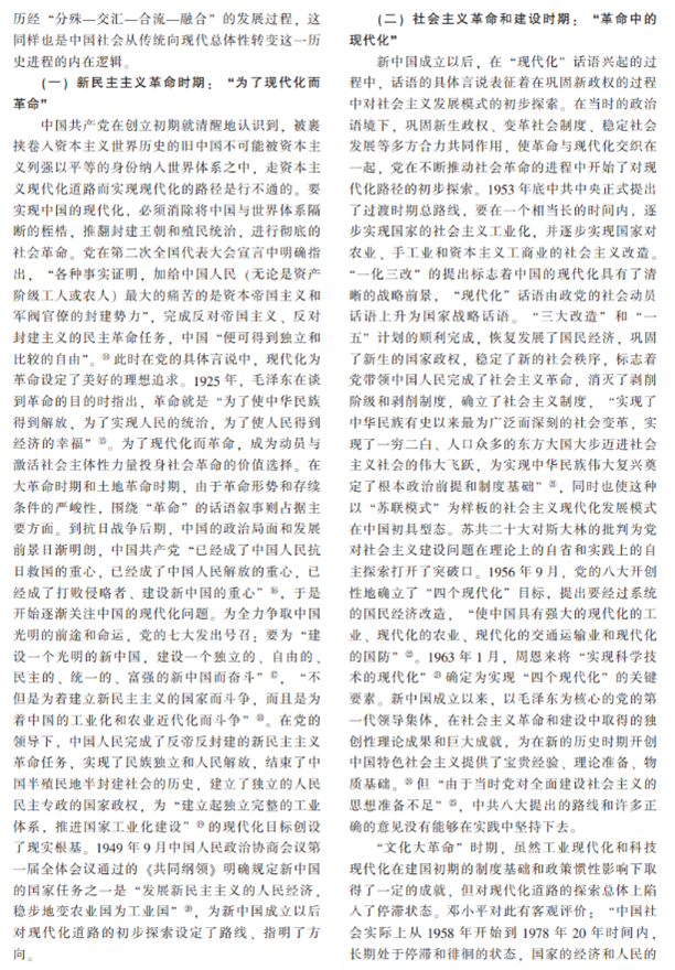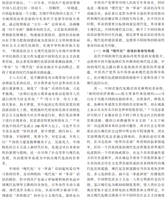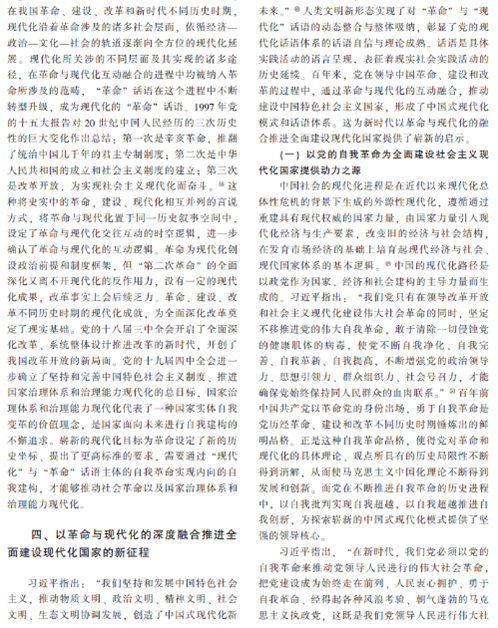 “革命”和“现代化”无疑均是社会生产关系变革的重大变量,两者共同作用于党的百年光辉奋斗历程之中,并呈现出渐趋融合的发展态势。文章以“革命”话语与“现代化”话语的理论互动为观察视角,对二者在不同阶段的具体内涵及相互关系进行系统梳理,归纳了其相互构建与相互融合的内在逻辑,突破了现代化范式和阶级革命范式的相互对峙,体现了中国特色政治学话语体系的蓬勃活力,为以“中国式现代化”视角理解中国革命提供了有益借鉴。