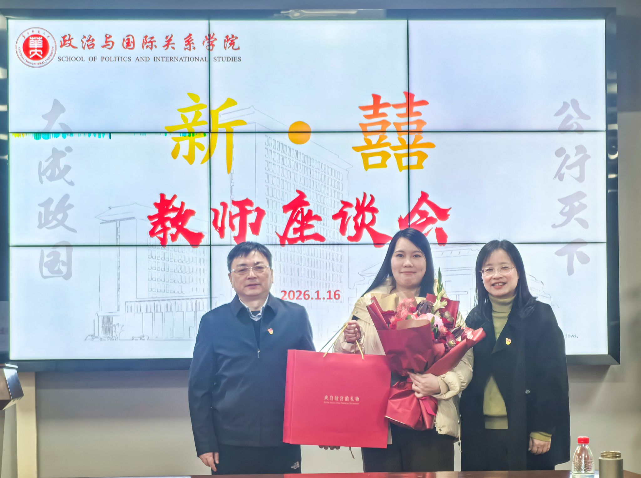(通讯员 丁浩哲)1月16日,学院2025年度“新·囍”教师座谈会在文科科研楼南楼1005会议室举行。院党委书记闫丽莉、院长胡宗山率院党政领导班子全体成员,以及国际政治系主任赵长峰,科学社会主义研究所教工党支部书记余维海,政治学系主任张必春,国际政治系教工党支部书记赵宁宁,教工行政党支部书记李诗溢出席座谈会,共同为本年度新入职教师鄢传若斓、张思意,以及新婚的陈婉玉、彭康珺老师送上祝福。座谈会由院工会主席、政治学系教工党支部书记钱道赓主持。